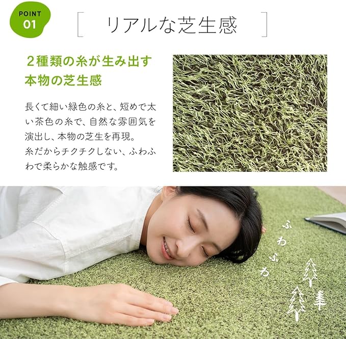 長くて細い緑色の糸と短めの茶色の糸でリアルな芝生を表現。ふわふわで柔らかな触り心地です。