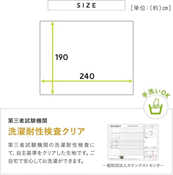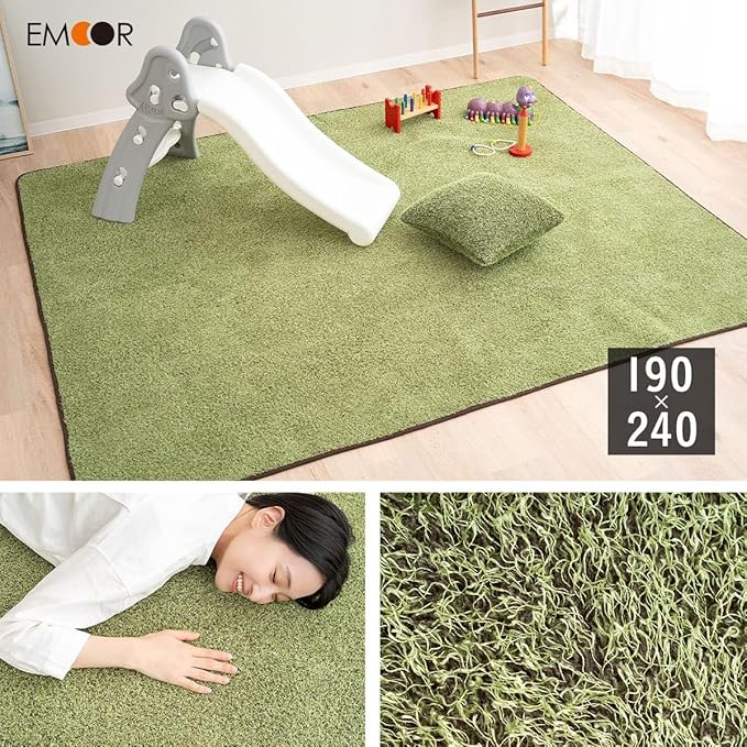 【サイズ】約幅240 奥行190cm 【素材】■表生地 緑色:ポリエステル100%(シャギー生地)/茶色:ポリエステル100%(フランネル生地) ■中材 ウレタンフォーム 25D ■裏地 不織布(ノンスリップ加工) 【カラー】グリーン 【機能】低ホルムアルデヒド (A-A0値:0.02)・ホットカーペット対応・床暖房対応 【お手入れ方法】手洗いで洗濯可能 【製造国】中国