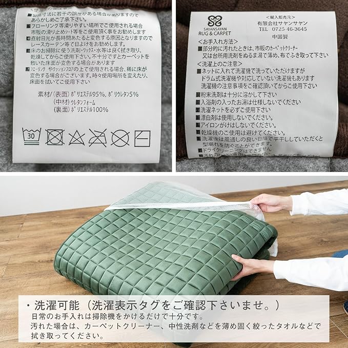 【備考】丸洗い可能(洗濯ネットを使用し、手洗いコースをお選び下さい。洗濯機の取り扱い説明書をご確認の上、適した洗濯コースをお選びください。)洗濯後はすぐに形を整え日陰で干してください。乾燥機は使用できません。大きめサイズの洗濯に関しては、コインランドリー等をご使用ください。(190 190cm以上推奨)ご自宅の洗濯機容量が異なるため、お客様にてご確認ください。※詳細は、商品にある品質タグを確認ください。 / ※こちらの画像は 190x240cm を使用しております。 / この商品は「カハヴィタウコ」と同じシリーズのキルティングラグです。/ 商品は専用の袋にお入れして[折りたたみ]の状態でお届けいたします。