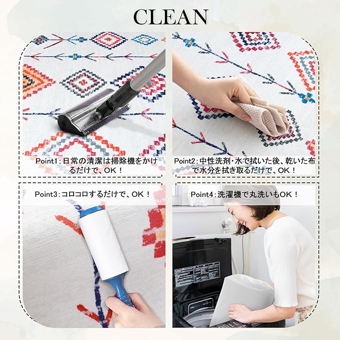【お手入れ簡単・洗濯機対応】毛足がないため、ホコリやゴミが絡みにくく、日常のお手入れはコロコロや掃除機で簡単に完了。泥汚れがついた場合は、手洗いまたは洗濯ネットに入れて洗濯機で洗えます。※風通しの良い場所で陰干ししてください。アイロン・乾燥機の使用は避けてください。