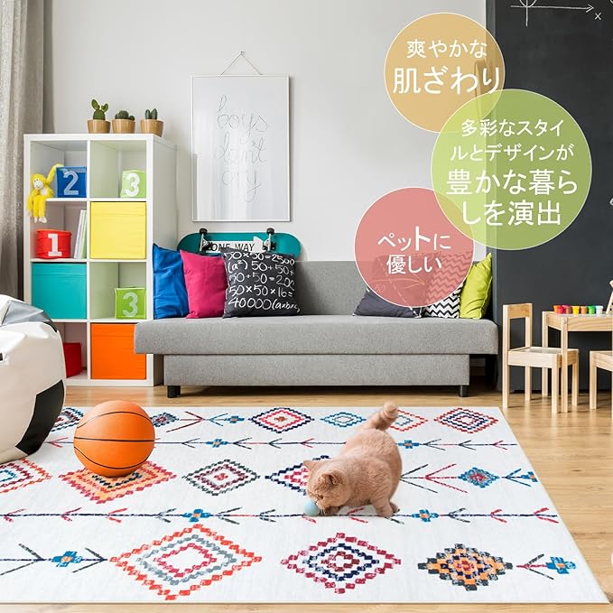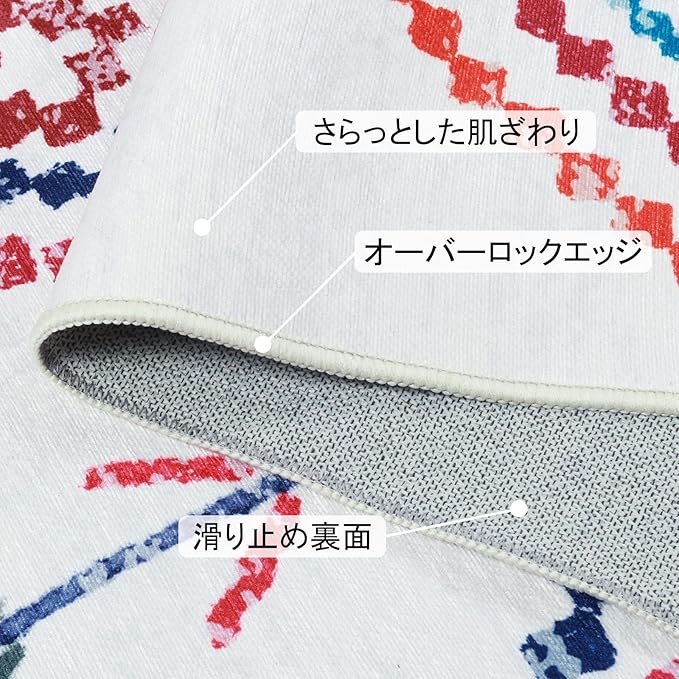 【カラフルなデザイン】さまざまなスタイルのパターンからお選びいただけます。民族風幾何パターンが目を引きます。白地に、赤色、青色、オレンジ色などの菱形や矢印、小花模様がバランス良く。伝統と現代が融合し、シンプルで個性的。先端印刷技術で平織り生地に繊細画像をプリントし、上品さを演出。端はオーバーロック加工、角は細いパイピングで、耐久性と軽やかな印象を兼ね備えます。