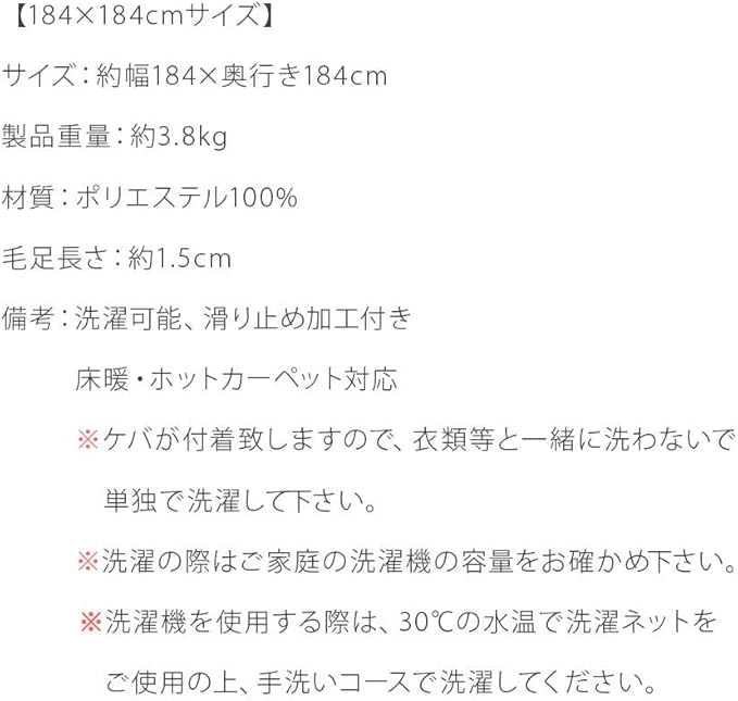 【備考】洗濯可能、滑り止め加工付き、床暖・ホットカーペット対応
