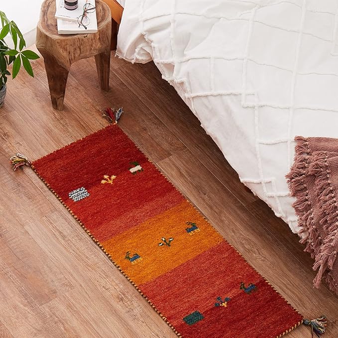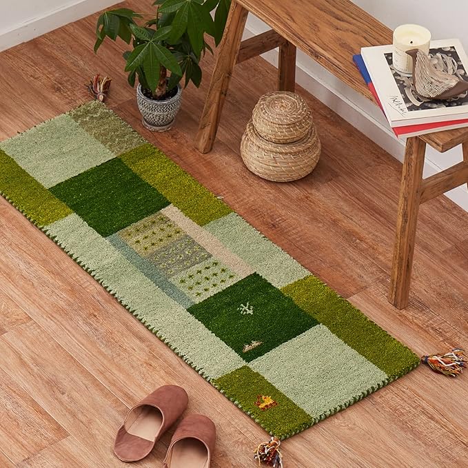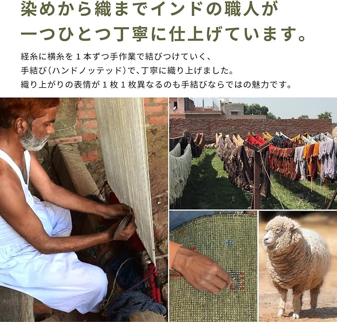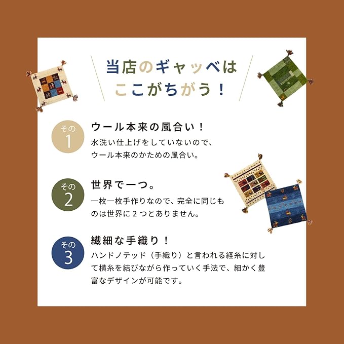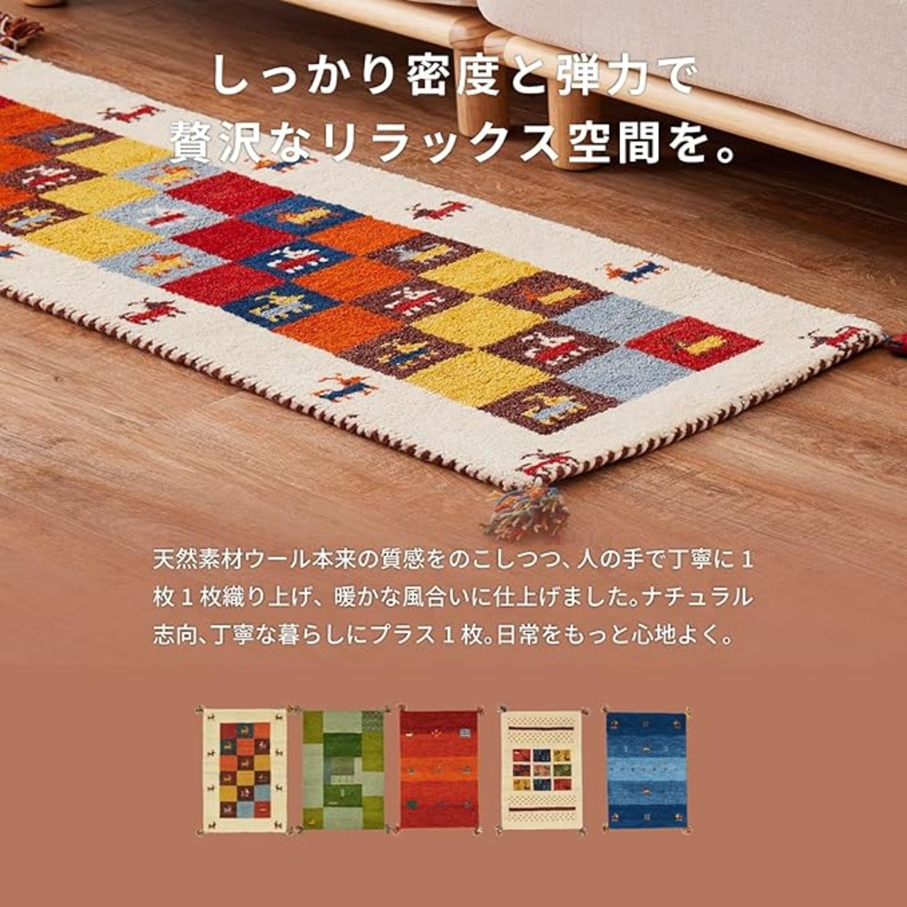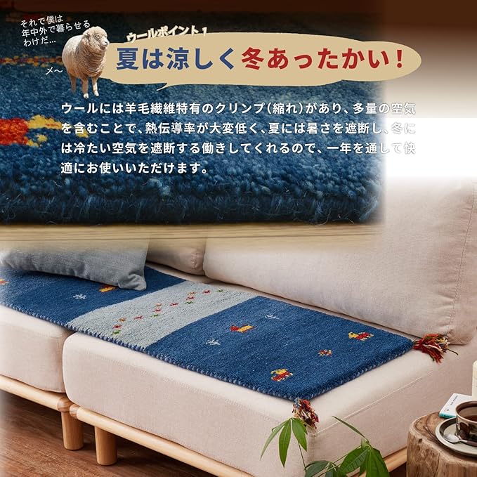 丁寧な手織り手法で使用時間の経過とともに味わいが深まる「ギャッベ」。ウール素材は暖かく冬に適しているイメージがありますが、温度差の激しい環境で育った羊から取れる羊毛(ウール)は、保温性と湿度を調節する機能に優れています。夏の湿気にも適しておりオールシーズンご使用いただける素材です。