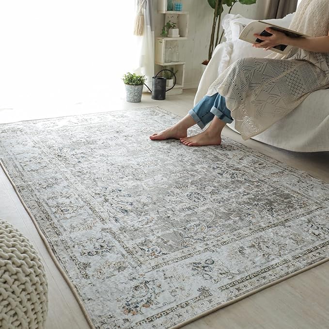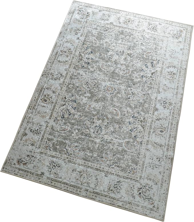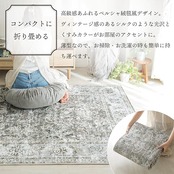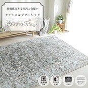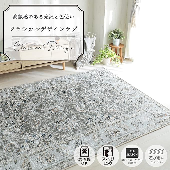【シルクのような光沢と肌触り】毛足が短く、遊び毛の出にくいしっとりとしたペルシャ絨毯風のプリントラグです。しっとり、さらさらとした肌触りで、素足でも過ごせる気持ちよさがあります。また、光沢感があり、光の加減で全然違う印象にもなります。表情豊かで、飽きにくく、高級感のあるラグです。近づいてもプリントとはわかりずらい点もポイントです。また、裏面には滑り止めがついているので、走り回ってもずれにくくなっています。