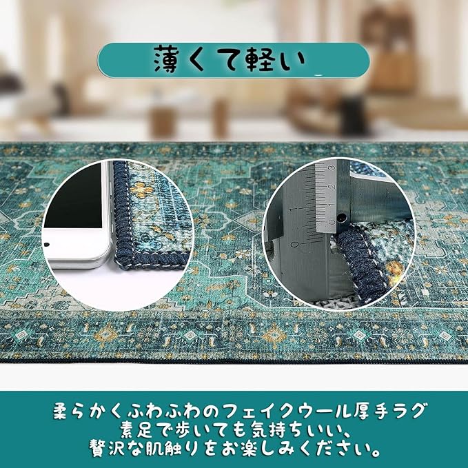 【ペルシャ風デザイン】高精度プリント技術で繊細な模様を再現。伝統的なペルシャ模様をモダンにアレンジした上品なデザインのカーペットで、シンプルな空間のアクセントに最適です。縁は巻き縫い処理でほつれを防止、角まで丁寧に仕上げた軽やかな見た目が特徴です。