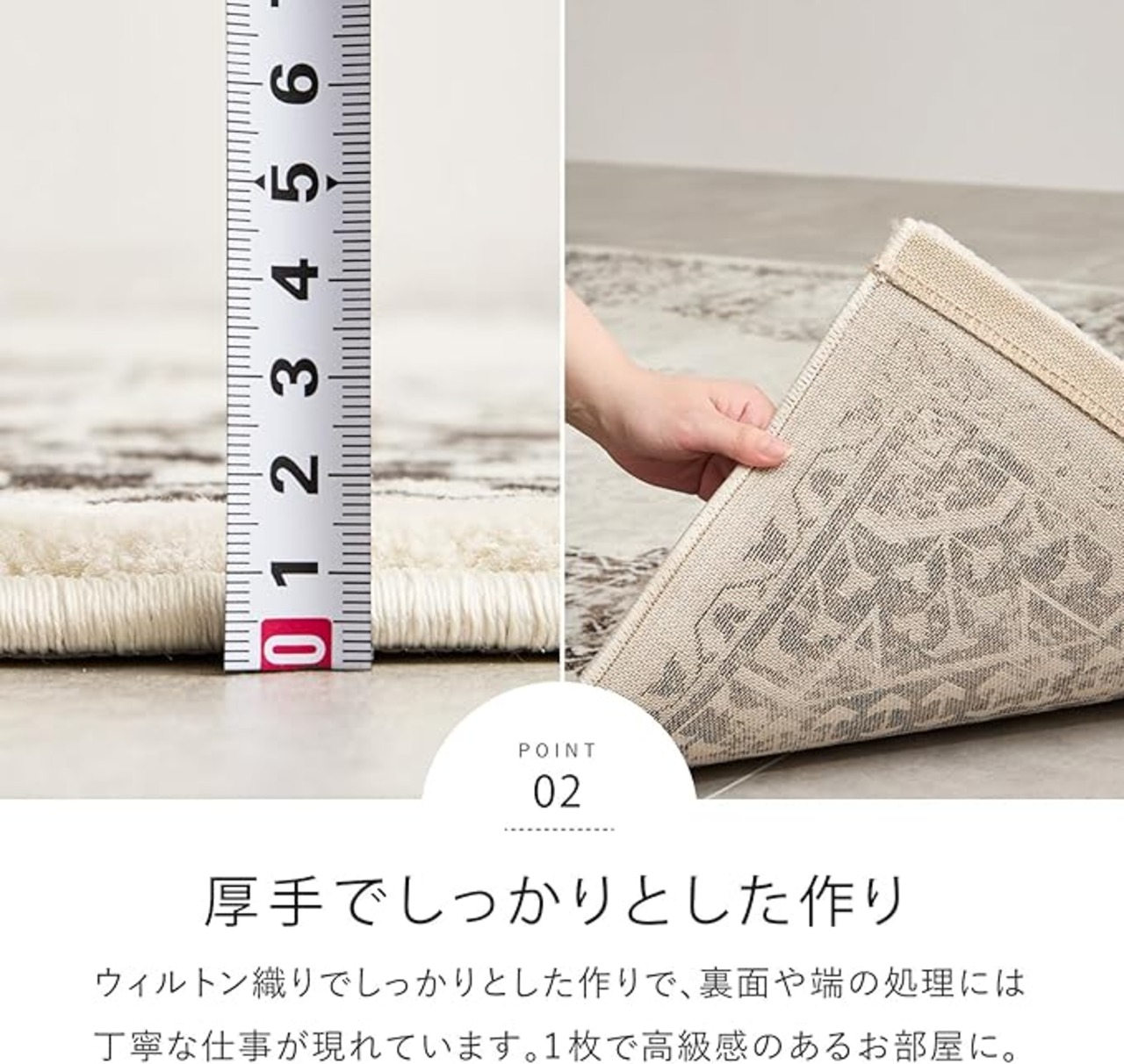 しっかりと織り上げられた厚みのあるウィルトン織りです。足元からリッチな触り心地をお楽しみいただけます。