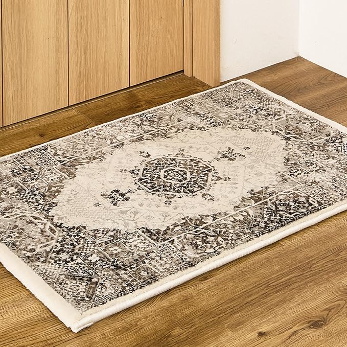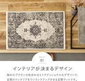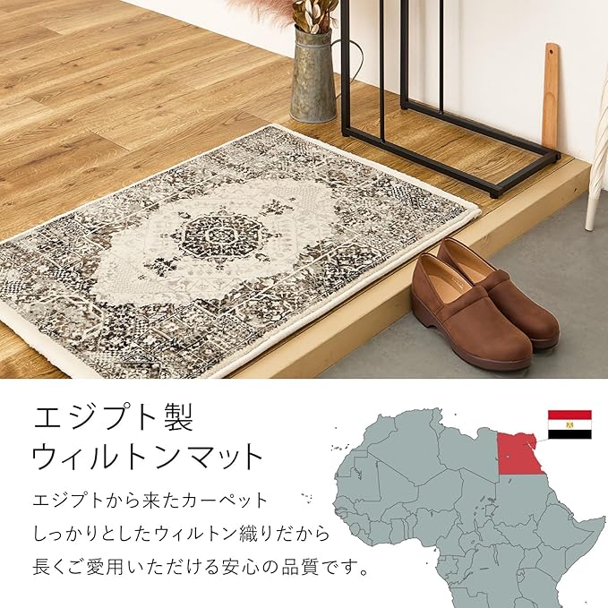 ベージュをベースにダークブラウンで描かれたトラディショナルな柄がシックで落ち着いた雰囲気のウィルトン織りのマット。オリエンタルなスタイルはもちろん、ヴィンテージ風などさまざまなインテリアにマッチします。