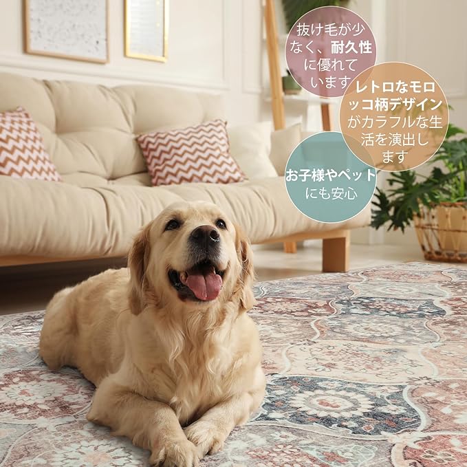 【幅広く活躍】ラグは機械織り製造で、丈夫で破れにくく、床を保護すると同時にインテリアとしても活用できま す。端縁にはオーバーロックの加工を施し、遊び毛が出たり、形を崩れたりしにくく、優れた耐久性を実現 します。また、ほどよい厚さで、オールシーズンお使いできます。ベッドサイド、リビングルーム、ベランダ、やダイニングの テーブルの下など様々なシーンで活躍します