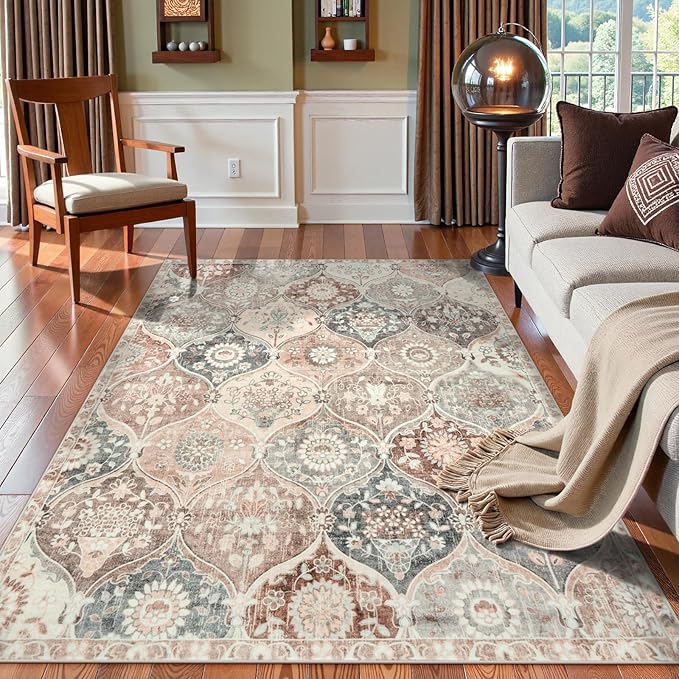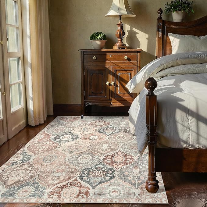 【柔らかなヴィンテージ風ラグ】先端のプリント技術を駆使し、幾何学模様と花飾りが緻密に配された生地は、触れるとしっとりとした柔らかさで心地よい癒しを届けます。ベージュやライトブラウン、グレーといった落ち着いたトーンがモロッコ風のアーチフレームに配され、エレガントなヴィンテージ感を演出します。ファブリック製のソファや木目調の家具と組み合わせれば、リビングにエスニックで温かな雰囲気をまとわせてくれるでしょう。