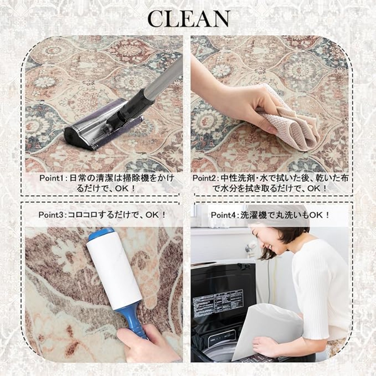 【お手入れ簡単】毛足は短くて密度が高く、ゴミや髪が絡みにくく、日常の清潔は掃除機をかけるだけでキレイ になります。また、汚れた場合は手洗いや洗濯ネットに入れて洗濯機で洗うことができます(ご注意:風通し の良いところで陰干しし、アイロン、乾燥機のご使用をお避け下さい。)