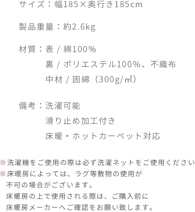 【サイズ】幅185 奥行き185cm 【製品重量】約2.6kg