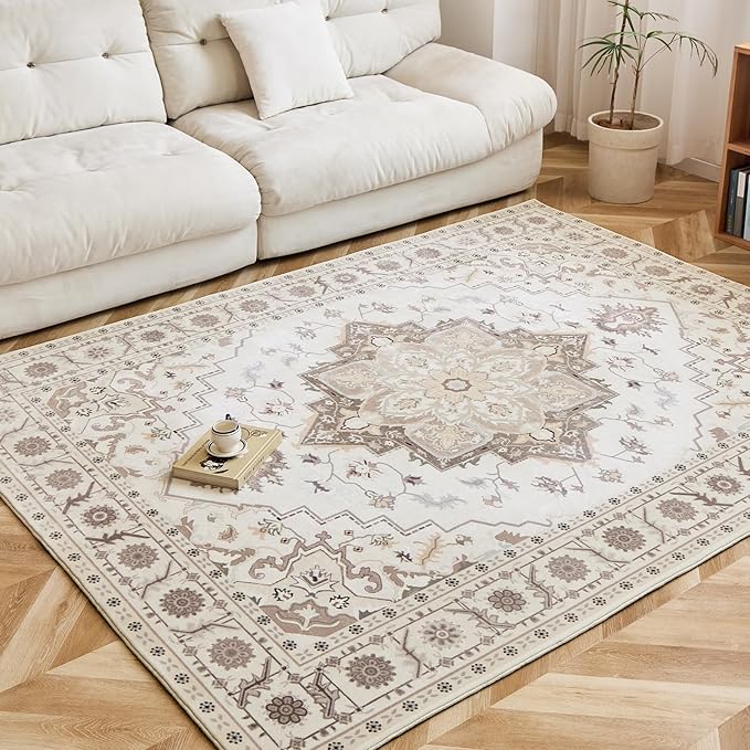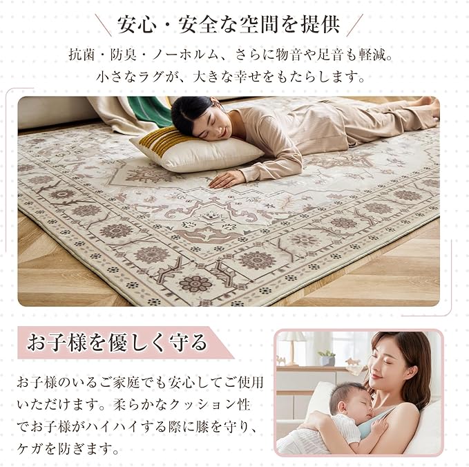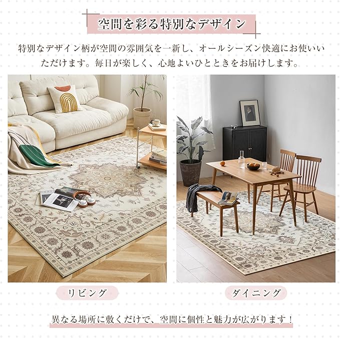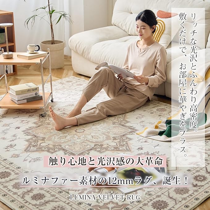 HARUMIN ラグ 北欧 カーペット 【上品な光沢感】 おしゃれ リビング 至極の肌触り ラグマット ペルシャ風 厚手12mm 高密度ルミナファー 耐磨耗性 ダイニングマット 軽量 洗える 絨毯 オールシーズン適用 滑り止め付 寝室 抗菌防臭 防音 花柄 190*240(約3畳) レトロベージュ | KAZESHOP