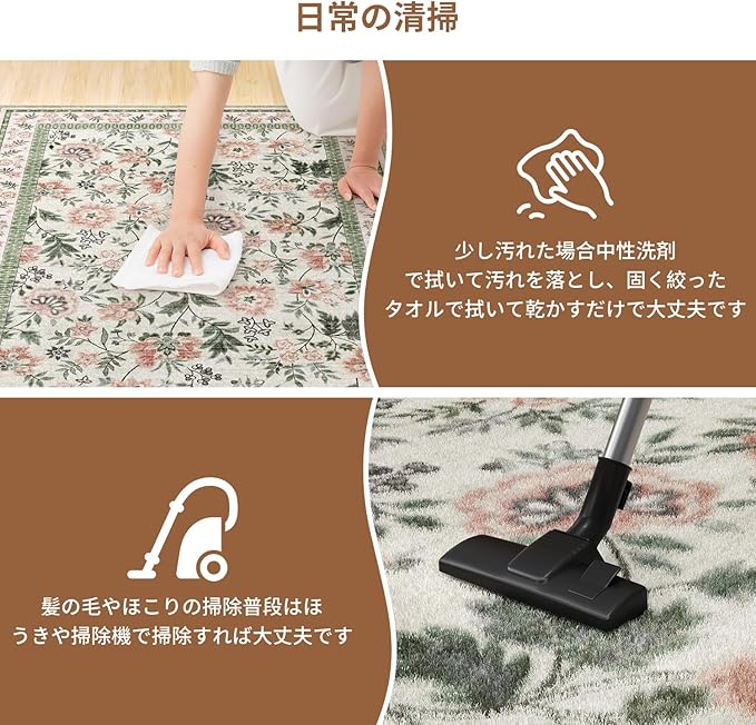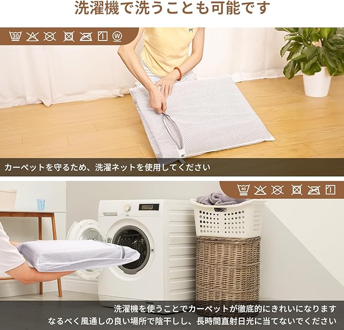 【洗濯機で洗え、日常の手入れが簡単】濡らしたり汚したりする心配はありません。VIGORVANのカーペットは触りが滑らかで、ゴミが絡まりにくいです。一部が汚れた感じた場合は、粘着式のクリーナーや掃除機で処理できます。カーペット全体を清潔にしたい場合は、洗濯ネットに入れ洗濯機で洗うだけです。VIGORVANカーペットは洗濯機洗いに対応しています。