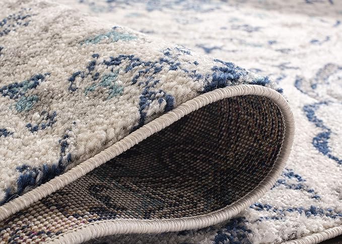 陰影のあるグレーとライトブルーのラグで、モダンでありながらクラシックな雰囲気もあります。