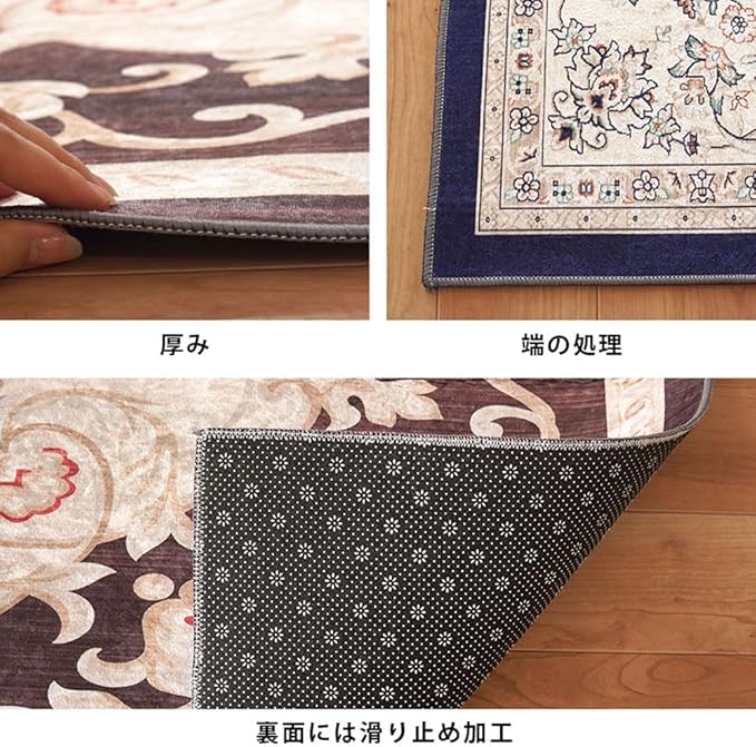 【高級感のあるペルシャ絨毯風デザイン、オールシーズン使えるラグマット】表地は毛足短めのサラッとタッチ。お掃除がしやすく、オールシーズン通してお使いいただけます。やや薄め・軽量で取り扱いしやすいのもポイント。裏面には滑り止め加工が施されているので、フローリング等に直接敷いてもズレにくく安心。ペルシャ絨毯のような上品なデザインで、お部屋のインテリアを美しく彩ります。