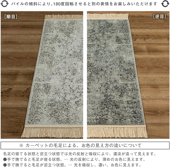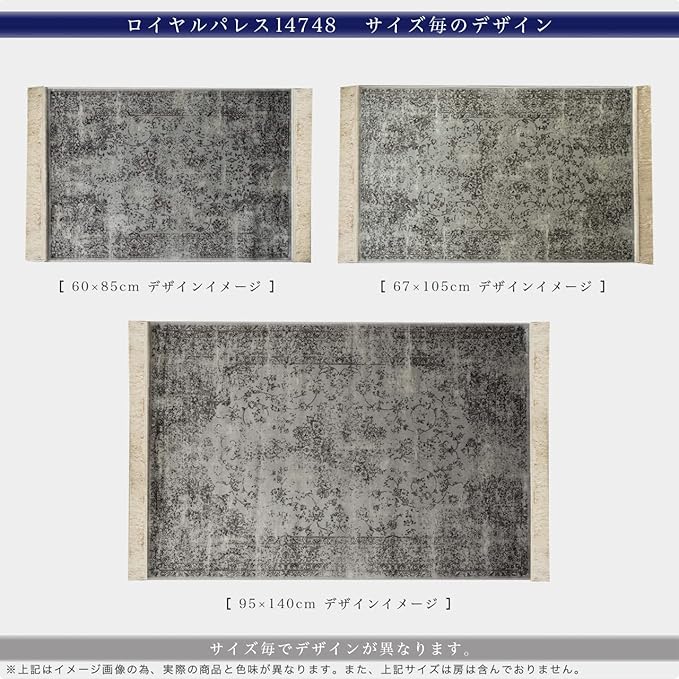 【輸入カーペットを安心してご利用いただくためのお願い】 ●輸入ラグに関して ※同じ商品でも製造ロットの違いによって、サイズや、色味、柄模様の左右が反転していたり、位置がズレている場合がございます。ただし、現地の工場や倉庫での検品をクリアした商品を輸入しています。あらかじめご了承くださいませ。/ ●においに関して ※ご使用当初、裏面に塗られる仕上げの接着塗料(ラテックス剤)のにおいがする場合がございます。人体への影響はありませんが、においに敏感の方や、ご心配の方はご理解の上ご購入お願いいたします。開封後常温のもとで気化(蒸発)するため、においはご使用につれてなくなります。気になる場合は風通しの良いところで陰干ししていただきますと、より早く解消されます。/ ●サイズに関して ※カーペットの製法上、表示サイズより0~3%の誤差がございます。/ ※いずれも商品の初期不良ではございませんので返品・交換は行なっておりません。(※お客様で返品の送料ご負担によるキャンセルは、返品規定に基づきお受けさせていただきます。)/ ※裏面の製品シールは剥がさないでご使用ください。