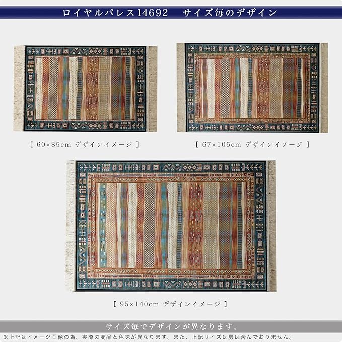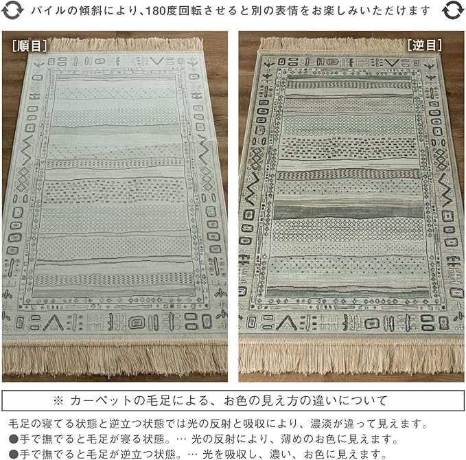 【輸入カーペットを安心してご利用いただくためのお願い】 ●輸入ラグに関して ※同じ商品でも製造ロットの違いによって、サイズや、色味、柄模様の左右が反転していたり、位置がズレている場合がございます。ただし、現地の工場や倉庫での検品をクリアした商品を輸入しています。あらかじめご了承くださいませ。/ ●においに関して ※ご使用当初、裏面に塗られる仕上げの接着塗料(ラテックス剤)のにおいがする場合がございます。人体への影響はありませんが、においに敏感の方や、ご心配の方はご理解の上ご購入お願いいたします。開封後常温のもとで気化(蒸発)するため、においはご使用につれてなくなります。気になる場合は風通しの良いところで陰干ししていただきますと、より早く解消されます。/ ●サイズに関して ※カーペットの製法上、表示サイズより0~3%の誤差がございます。/ ※いずれも商品の初期不良ではございませんので返品・交換は行なっておりません。(※お客様で返品の送料ご負担によるキャンセルは、返品規定に基づきお受けさせていただきます。)/ ※裏面の製品シールは剥がさないでご使用ください。