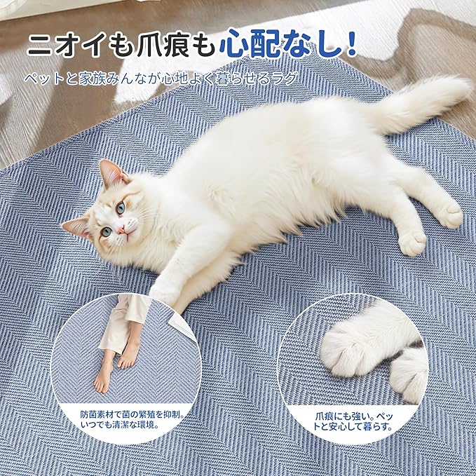 【人とペットに優しい素材】 ホルムアルデヒドなどの有害物質を含まない、安全な素材を使用。小さなお子様やペットがいるご家庭でも、安心して使えるラグです。さらに抗菌防臭加工をプラス。品質には自信を持っており、万が一の際も安心の保証付きカーペットです。