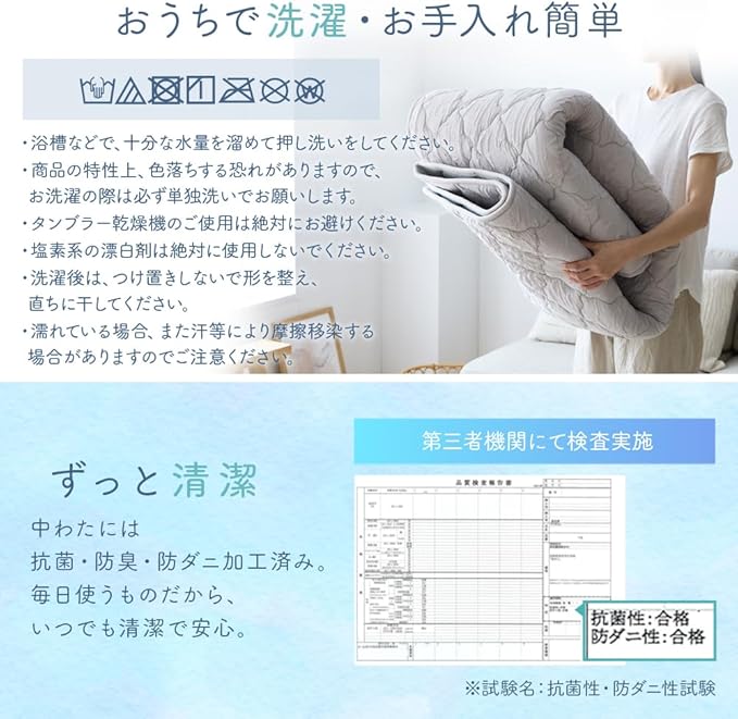 中綿:上層 ポリエステル70%・レーヨン30%(抗菌防臭防ダニ加工)、下層 ウレタンフォーム