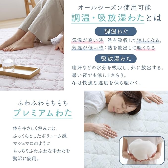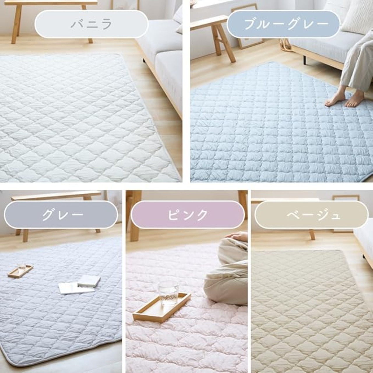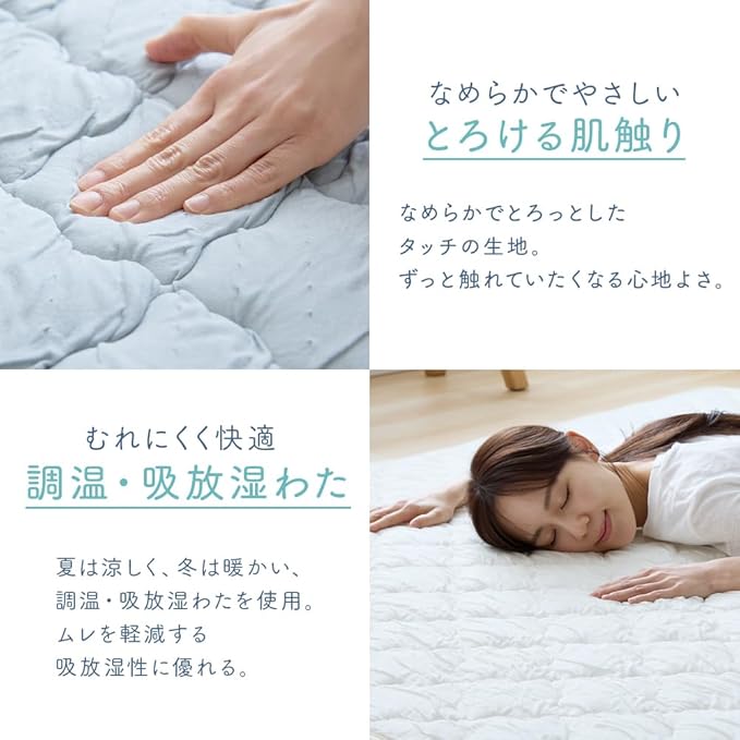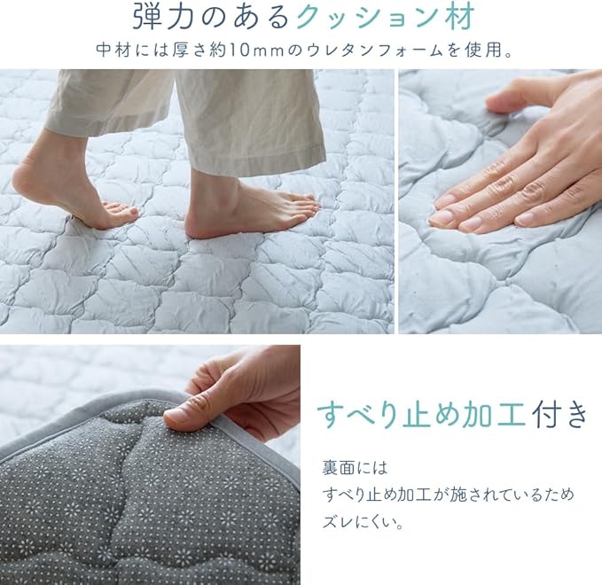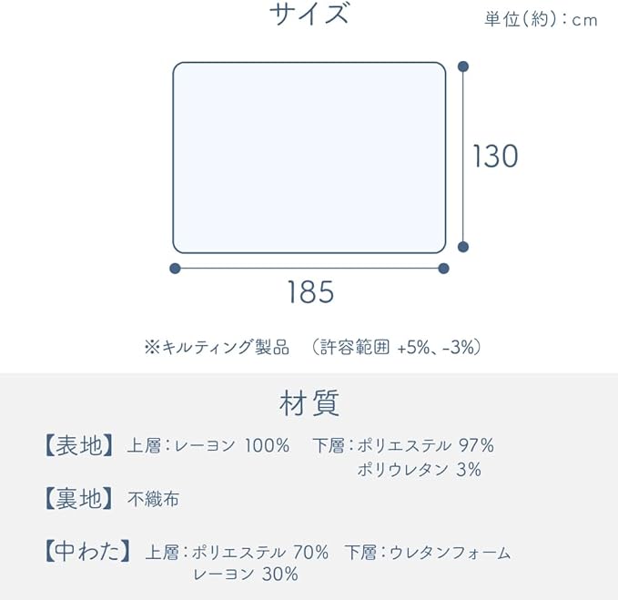 材質 表地:上層 レーヨン100%、下層 ポリエステル97%・ポリウレタン3% 中綿:上層 ポリエステル70%・レーヨン30%(抗菌防臭防ダニ加工)、下層 ウレタンフォーム 裏地:不織布(滑り止め加工)