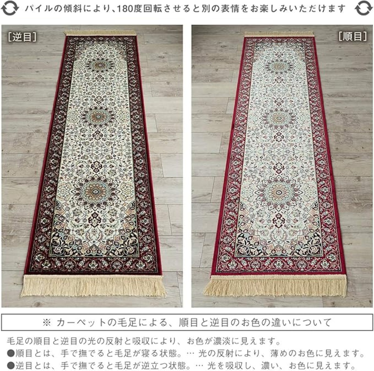 【輸入カーペットを安心してご利用いただくためのお願い】 ●輸入ラグに関して ※同じ商品でも製造ロットの違いによって、サイズや、色味、柄模様の左右が反転していたり、位置がズレている場合がございます。ただし、現地の工場や倉庫での検品をクリアした商品を輸入しています。あらかじめご了承くださいませ。/ ●においに関して ※ご使用当初、裏面に塗られる仕上げの接着塗料(ラテックス剤)のにおいがする場合がございます。人体への影響はありませんが、においに敏感の方や、ご心配の方はご理解の上ご購入お願いいたします。開封後常温のもとで気化(蒸発)するため、においはご使用につれてなくなります。気になる場合は風通しの良いところで陰干ししていただきますと、より早く解消されます。/ ●サイズに関して ※カーペットの製法上、表示サイズより0~3%の誤差がございます。/ ※いずれも商品の初期不良ではございませんので返品・交換は行なっておりません。(※お客様で返品の送料ご負担によるキャンセルは、返品規定に基づきお受けさせていただきます。)/ ※裏面の製品シールは剥がさないでご使用ください。