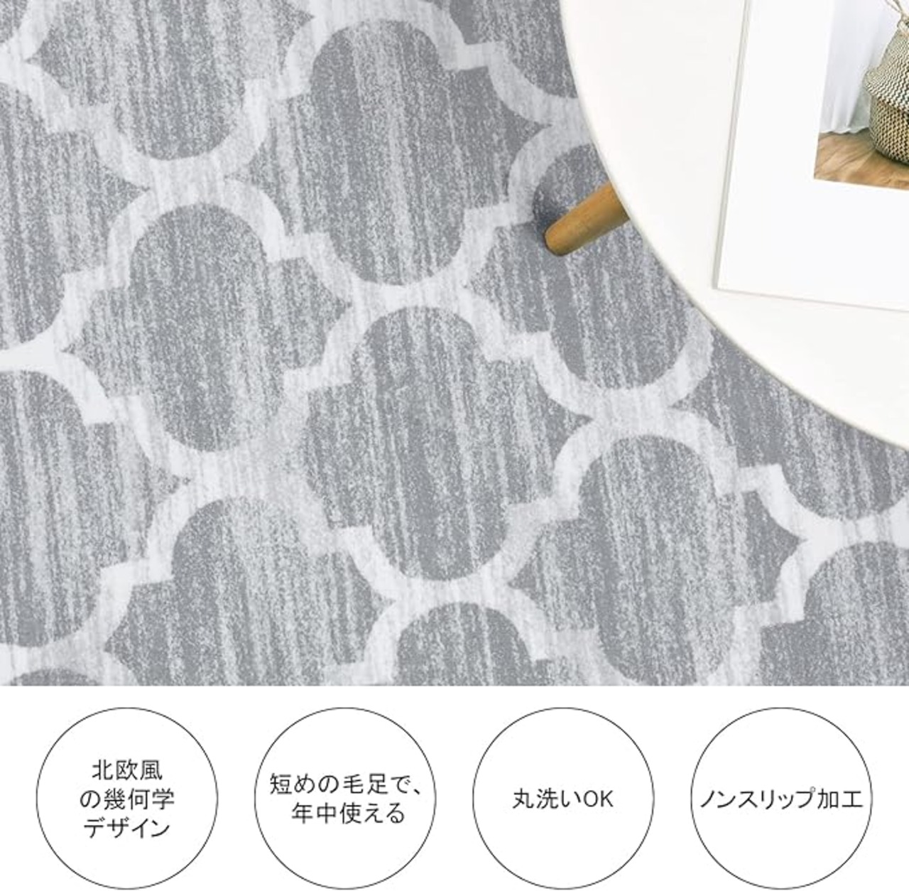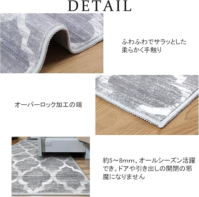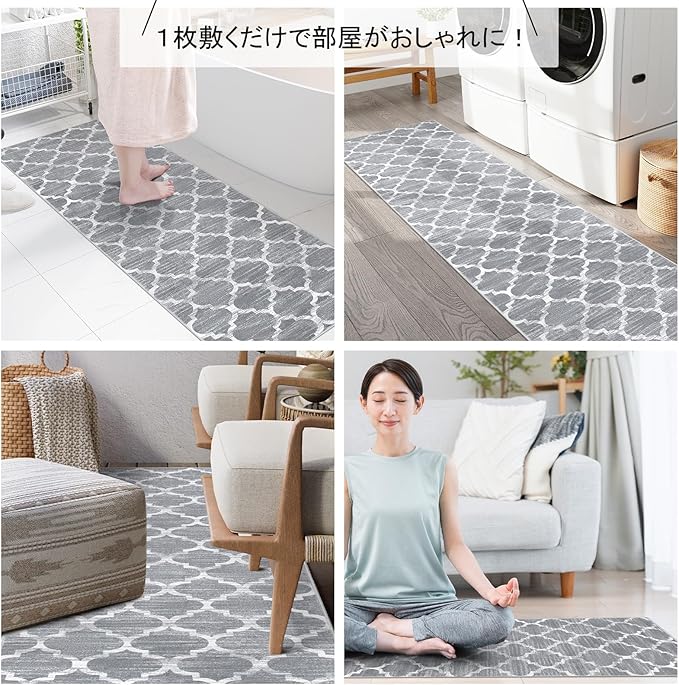 【幅広く活躍】ラグは機械織り製造で、丈夫で破れにくく、床を保護すると同時にインテリアとしても活用できます。玄関、廊下、キッチン、ベッドサイド、リビングルーム、ベランダ、バスルームなどに敷くとぴったりです。角は細いパイピングで、軽やかな印象に仕上げています。ひっかかりやズレが生じにくく、生活導線に敷いても安心です。