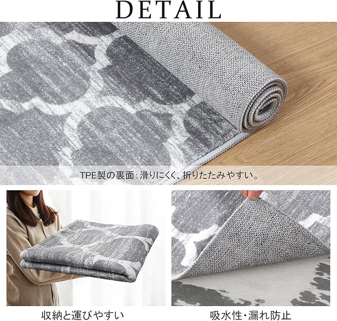 【滑り止め・持ち運び便利】TPEの裏面には滑り止め加工を施し、ひっかかりやズレが生じにくく、家事導 線に敷いてもお使いでき、子供やペットのいる家庭でも心置きなくご利用頂けます。また、吸水・防音仕様で、 足元を気にせずに動かすことができます。更に、薄くて軽い生地感で、女性でも余裕に折りたたみや持ち運び ができます(ご注意:他のマットの上に使用しても滑り止め効果も発揮します。)