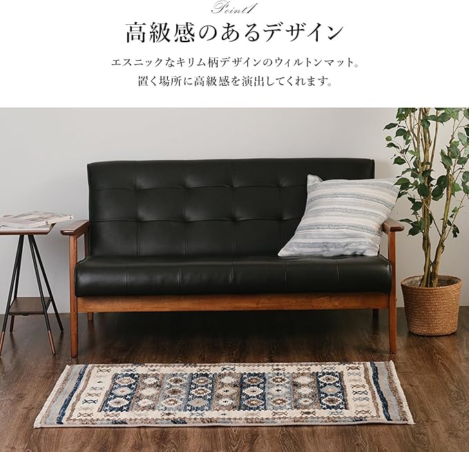 ウィルトン織りの玄関マットです。ウィルトン織りは非常に耐久性の高い織物です。家の中でも靴を履いて生活するヨーロッパで、土足で扱うことを前提として作られておりますので、長時間踏みつけてもヘタリにくく、弾力性もあり長くご使用頂けます。ポリプロピレンはヘタリにくく、耐久性に優れ、繊維の中でも軽い素材です。また、汚れが付着しにくく、遊び毛や毛玉が非常に出にくいという特徴もあります。