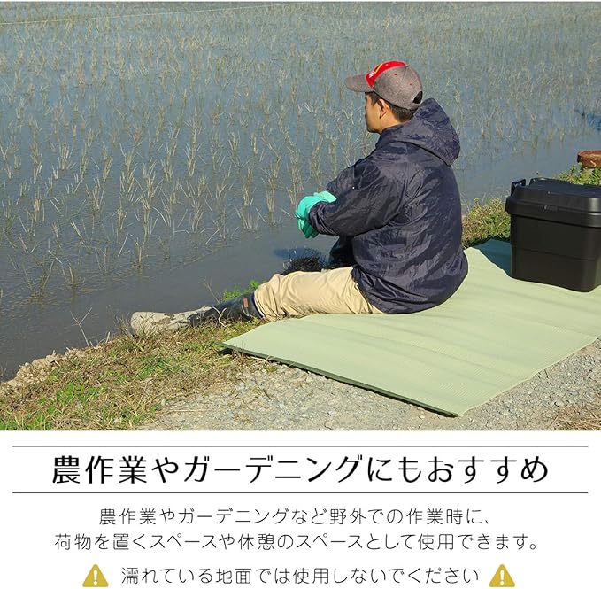 国産の水洗いができる丈夫な敷物です。農作業やガーデニングなど野外での作業時に、荷物を置くスペースや休憩のスペースとして使用できます。和室に敷くことで、畳への傷防止となります。ダニが発生しにくい素材です。