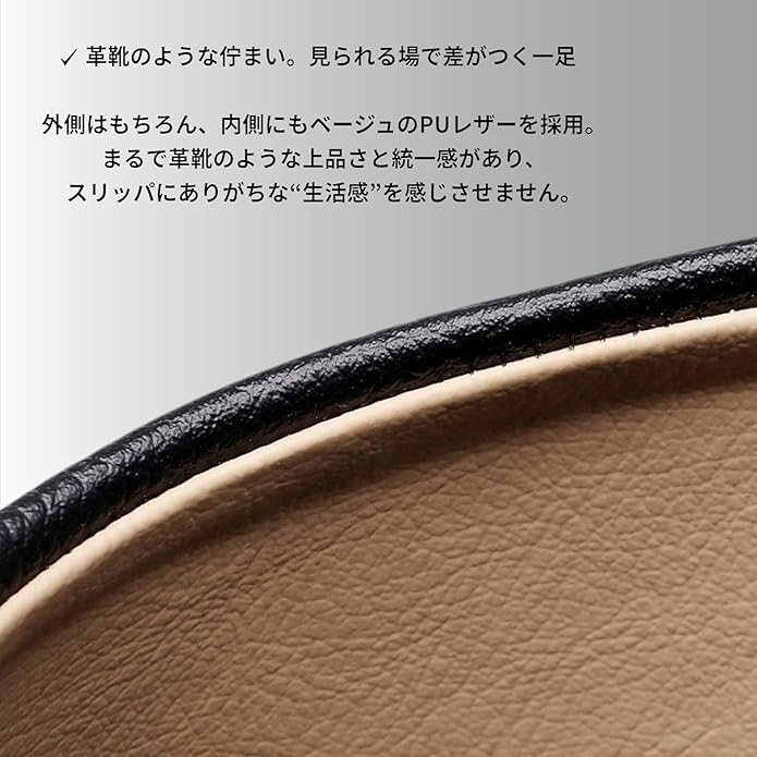 椅子張り地の老舗ブランドのPUレザーを使用したスリッパ。 家庭での使用はもちろん、卒業式入学式授業参観用として使用可能。 革靴のような“しっかり感”の秘密 外側:高級感のあるPUレザー 内側:明るいベージュで上品&清潔感◎ ソール(裏面):こちらもPUレザー仕上げで水拭きOK! 靴底まで美しいから、脱いだ後もだらしなく見えません。 見られる場面でも自信を持って履けるスリッパです。