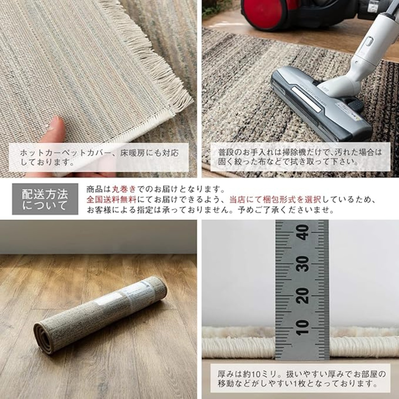 【輸入カーペットを安心してご利用いただくためのお願い】 ●輸入ラグに関して ※同じ商品でも製造ロットの違いによって、サイズや、色味、柄模様の左右が反転していたり、位置がズレている場合がございます。ただし、現地の工場や倉庫での検品をクリアした商品を輸入しています。あらかじめご了承くださいませ。/ ●においに関して ※ご使用当初、裏面に塗られる仕上げの接着塗料(ラテックス剤)のにおいがする場合がございます。人体への影響はありませんが、においに敏感の方や、ご心配の方はご理解の上ご購入お願いいたします。開封後常温のもとで気化(蒸発)するため、においはご使用につれてなくなります。気になる場合は風通しの良いところで陰干ししていただきますと、より早く解消されます。/ ●サイズに関して ※カーペットの製法上、表示サイズより0~3%の誤差がございます。/ ※いずれも商品の初期不良ではございませんので返品・交換は行なっておりません。(※お客様で返品の送料ご負担によるキャンセルは、返品規定に基づきお受けさせていただきます。)/ ※裏面の製品シールは剥がさないでご使用ください。