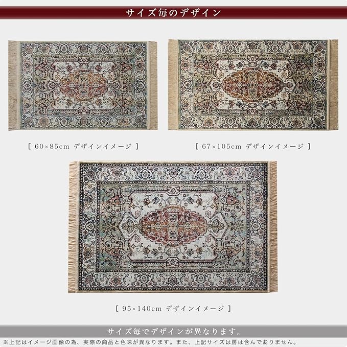 【輸入カーペットを安心してご利用いただくためのお願い】 ●輸入ラグに関して ※同じ商品でも製造ロットの違いによって、サイズや、色味、柄模様の左右が反転していたり、位置がズレている場合がございます。ただし、現地の工場や倉庫での検品をクリアした商品を輸入しています。あらかじめご了承くださいませ。/ ●においに関して ※ご使用当初、裏面に塗られる仕上げの接着塗料(ラテックス剤)のにおいがする場合がございます。人体への影響はありませんが、においに敏感の方や、ご心配の方はご理解の上ご購入お願いいたします。開封後常温のもとで気化(蒸発)するため、においはご使用につれてなくなります。気になる場合は風通しの良いところで陰干ししていただきますと、より早く解消されます。/ ●サイズに関して ※カーペットの製法上、表示サイズより0~3%の誤差がございます。/ ※いずれも商品の初期不良ではございませんので返品・交換は行なっておりません。(※お客様で返品の送料ご負担によるキャンセルは、返品規定に基づきお受けさせていただきます。)/ ※裏面の製品シールは剥がさないでご使用ください。