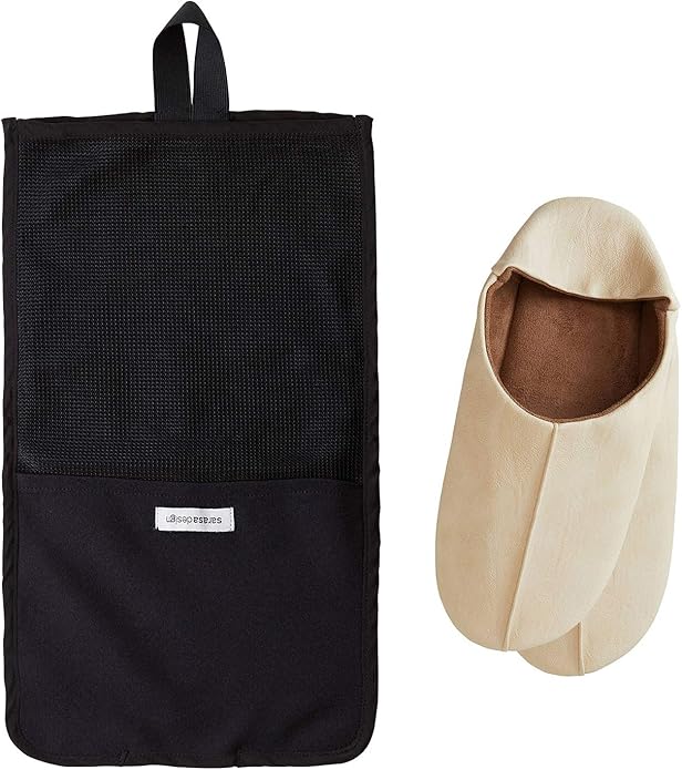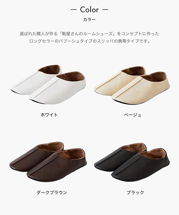 選ばれた職人が作る「靴屋さんのルームシューズ」をコンセプトに作ったロングセラーのバブーシュタイプのスリッパの携帯タイプ(専用ポーチ付き)。