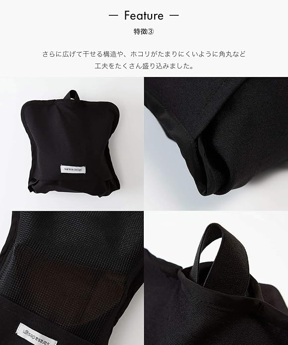 付属のポーチは、小さめバッグとも一緒にお持ちいただける持ち手付きのコンパクトデザインで、片面メッシュのため通気性が良く衛生面にも配慮しています。また広げて干せる構造や、ホコリがたまりにくいように角丸など工夫をたくさん盛り込みました。