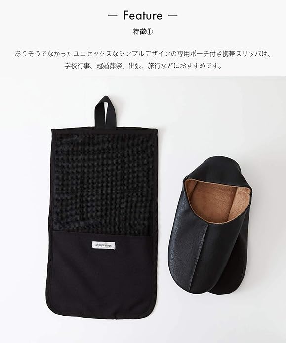 学校行事、冠婚葬祭、出張、旅行などにおすすめです。ありそうでなかったユニセックスなシンプルデザインの携帯スリッパです。