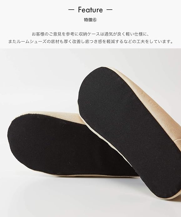 ●お客様のご意見を参考に収納ケースは通気が良く軽い仕様に、またルームシューズの底材も厚く改善し底つき感を軽減するなどの工夫をしています。