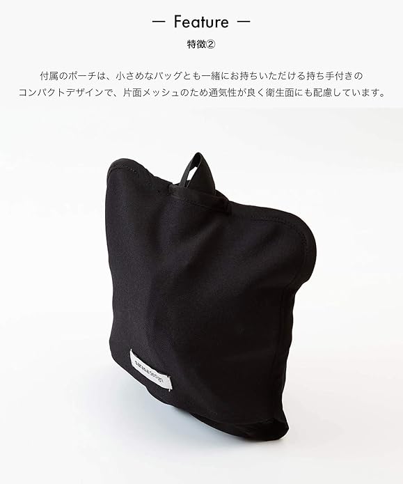 ●付属のポーチは、小さめバッグとも一緒にお持ちいただける持ち手付きのコンパクトデザインで、片面メッシュのため通気性が良く衛生面にも配慮しています。また広げて干せる構造や、ホコリがたまりにくいように角丸など工夫をたくさん盛り込みました。