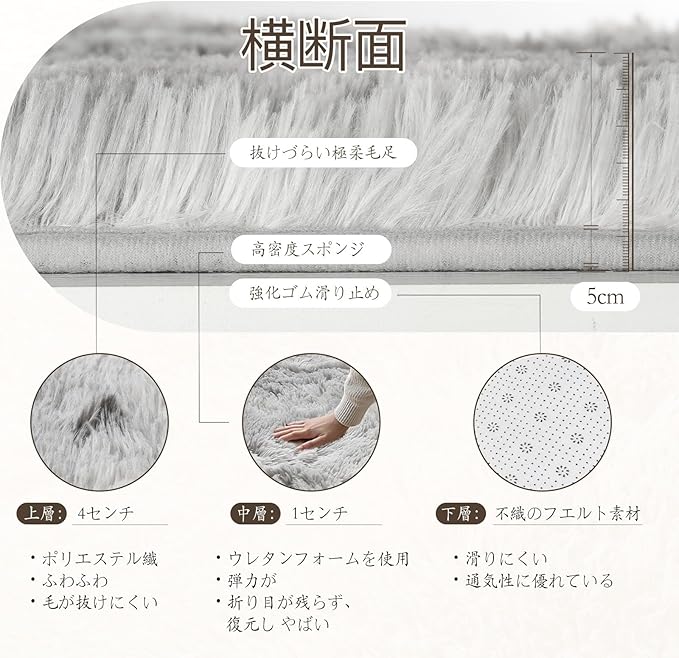 ラグマット カーペット 120x160cm 全厚約5cm 滑り止め付 洗えるラグ 抗菌 ふわっと手触り 防音絨毯 オールシーズ おしゃれな北欧風シャギーラグ 極厚ウレタンフォーム10mm 寝室、リビングルーム用のふわふわラグ、ライトグレ | KAZESHOP