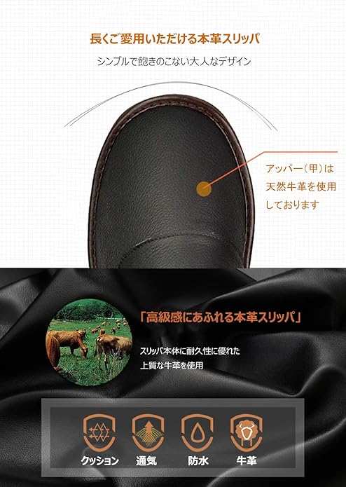 【オールシーズンに対応&多用途】天然牛革は断熱効率の高い素材なので、夏には快適に履けて、冬も暖かく足を包んでくれる、オールシーズン対応日常使いの室内スリッパです。新居や来客用、入学式や参観日、旅行、室内履き等 幅広く使える多目的スリッパ。お子様の受験や面接などの大切なシーンはもちろん、会社の説明会や事務所での応接用の上履きなど、シーンを選ばず幅広くご利用ください。ご自宅用のルームシューズなどの普段使いや御祝いや記念ギフトなどのプレゼントでも、ご好評いただいております。