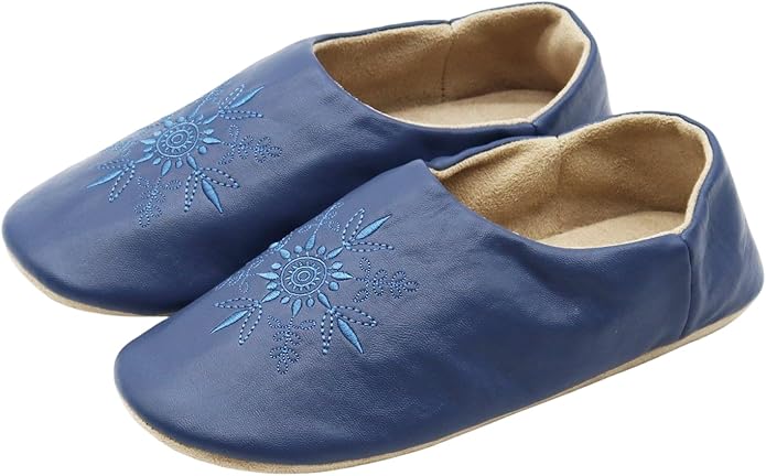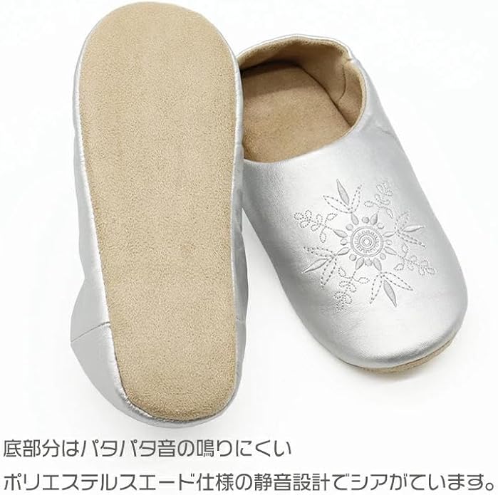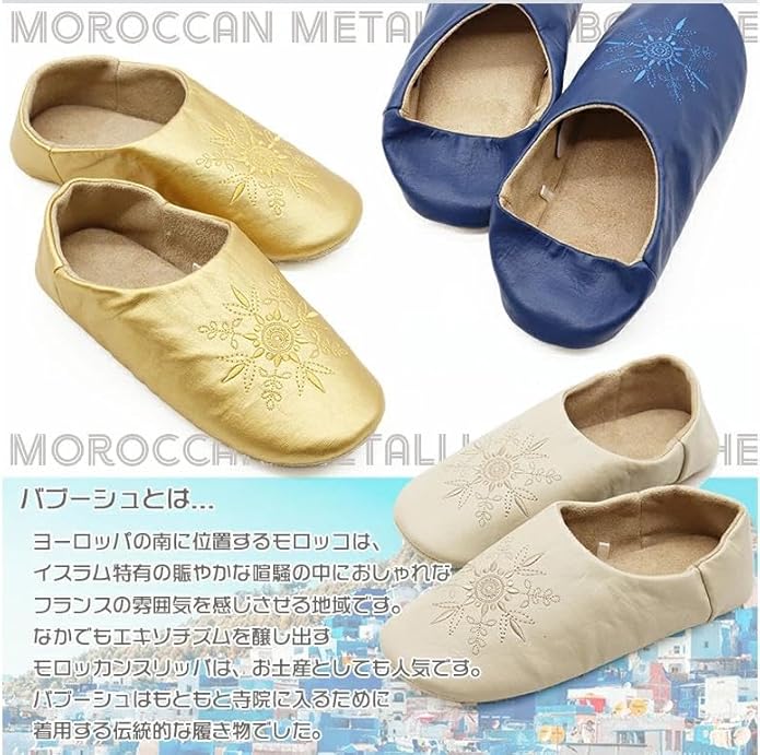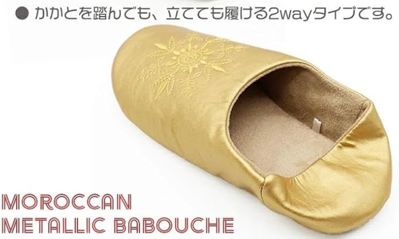 ☆バブーシュ!はもともと寺院に入るときに着用する伝統的な履き物で、メタリックな風合いにモロッコ風の刺繍を施した、カジュアルタイプのルームシューズ♪☆軽くて、歩きやすいのはもちろん、手入れのしやすさもおススメのポイント♪
