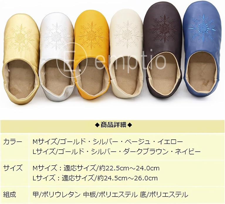 ☆素材構成:表/ポリエステル 底/ポリエステルスエード ☆古くからモロッコの暮らしと文化に根付いてきた民族的な履物であるバブーシュスリッパは、かわいくて 履きやすく、室内用スリッパとしておすすめ♪