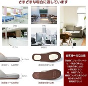 【静音 滑り止め】スリッパのアッパー部分がスリッパ全長の4分の3になったので、歩いていても脱げにくく、パタパタ音もなく、静音目的を実現した。妊娠方や高齢者へのこだわりに、スリッパの底面に前後2箇所に天然牛革の滑り止め加工も施した。