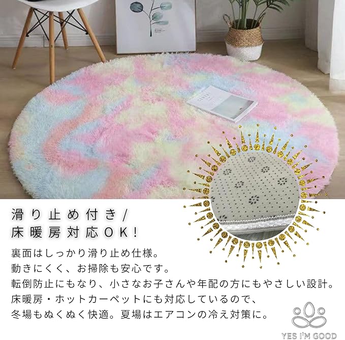 【YES I'M GOOD】の円形ラグマットは、直径80cmのちょうどよいサイズ感で、リビング・子供部屋・寝室・玄関など幅広く活躍。