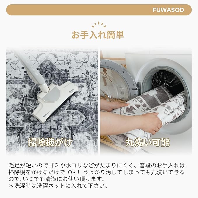 【お手入れ楽々】毛足が短いのでゴミやホコリなどがたまりにくく、普段のお手入れは掃除機をかけるだけでOK!うっかり汚してしまっても丸洗いできるので、いつでも清潔にお使い頂けます。ペットがいるご家庭にもおすすめです。また、重さが軽く、お部屋の移動や折り畳んでの収納も楽々です。*洗濯時は洗濯ネットに入れて下さい。