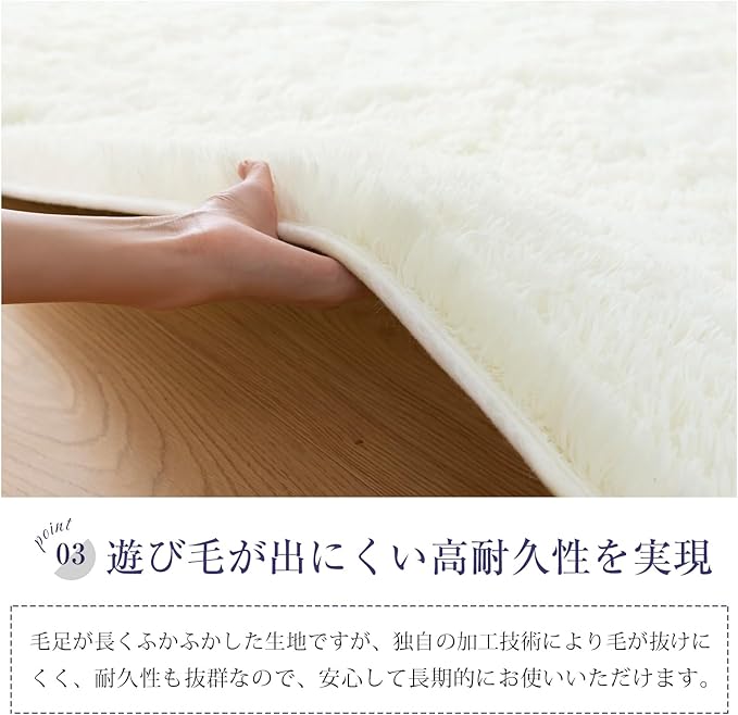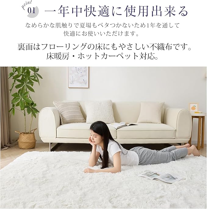 【夏涼しく・冬暖かいオールシーズン対応】通気性に優れたマイクロファイバー採用で夏はサラッと快適。耐熱加工済みでホットカーペット/床暖房対応の冬仕様。35mmのふわふわパイルが足元を優しく包み込み、一年中リラックス空間を創出します。