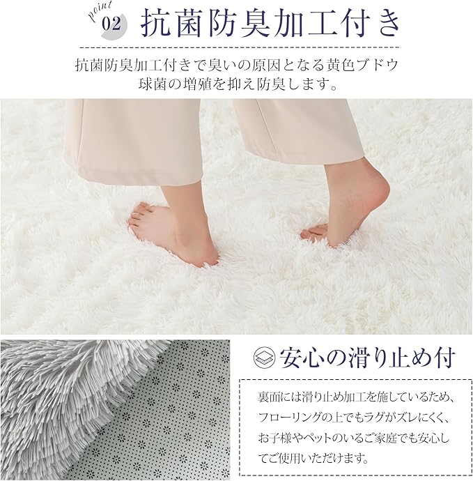 【抗菌・超強力滑り止め】抗菌防臭加工を施し、赤ちゃんやペットが直接触れても安心。特殊強化滑り止め裏地は掃除機使用時やお子様の激しい動きでも全くズレず、床を傷つけません。ホコリが立ちにくい構造で、アレルギー対策にも最適です。