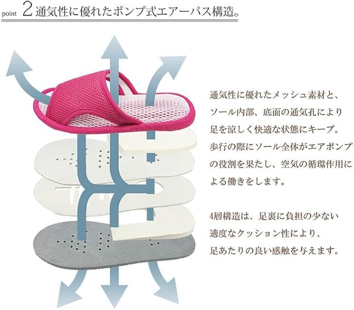 【素材説明】 甲/ポリエステル 中敷/ポリエステル 底/EVA樹脂 ☆この暑い夏に心地良い風が通るふしぎなスリッパが登場しました♪☆歩くたびにインソールポンプがこもった空気を押し出してくれる軽量スリッパ♪