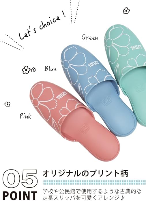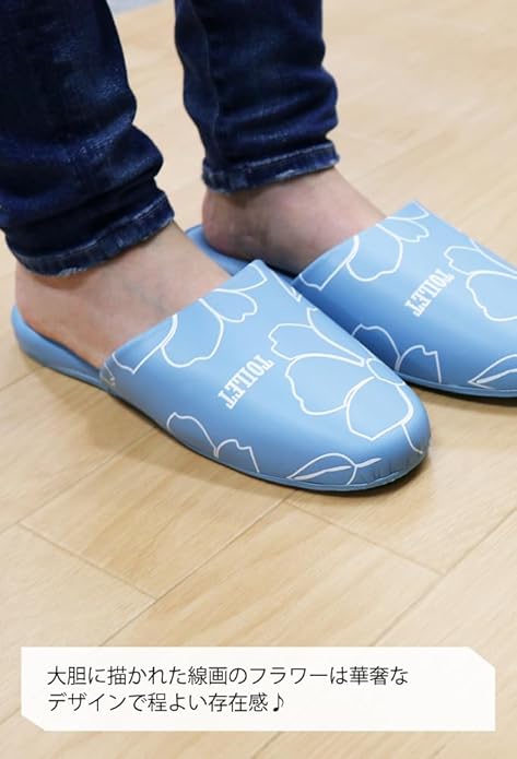 【花柄スリッパ】ビニール地にお花がプリントされた前かぶりタイプのスリッパです。わかりやすく「TOILET」の文字もプリントしてあり、ご自宅だけでなく会社や施設などのトイレにもおすすめです。
