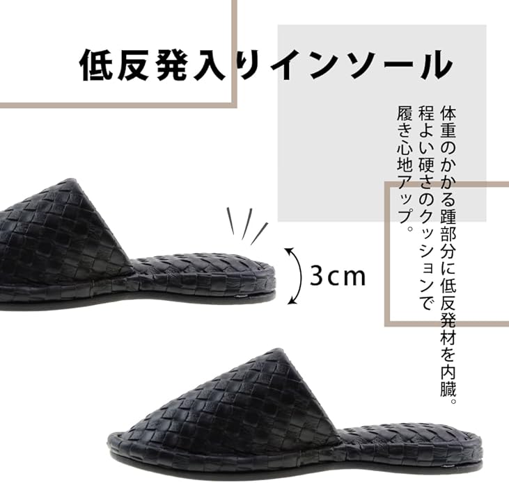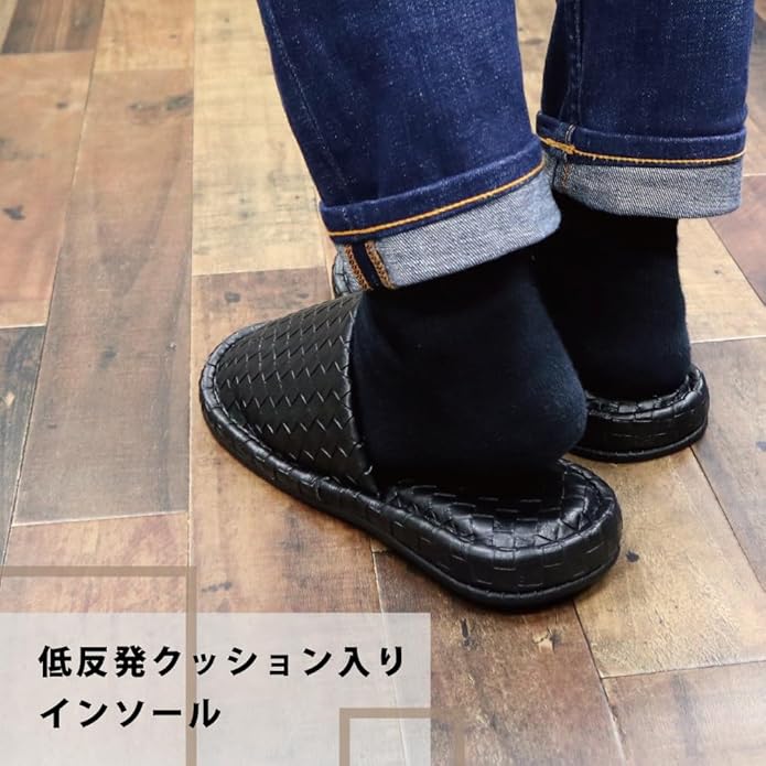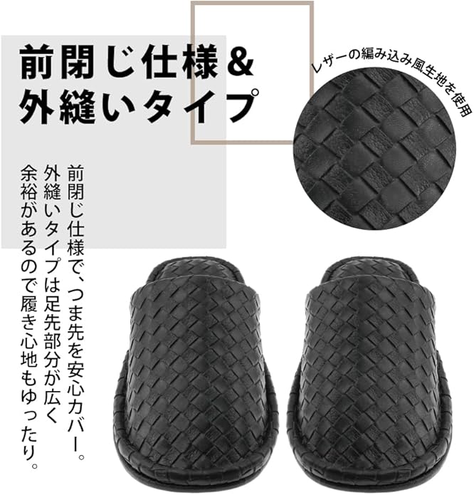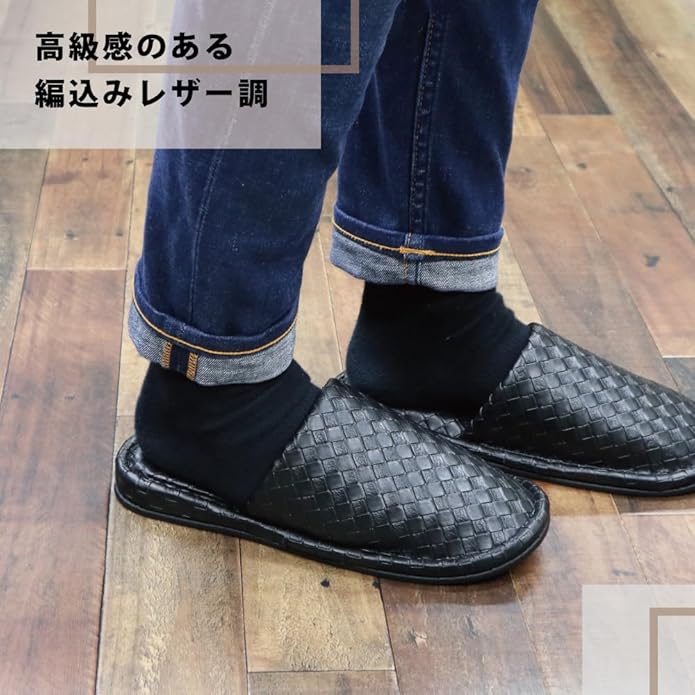 【高級感あふれるレザー調スリッパ】来客時にも活躍する高級感のあるスリッパです。レザー調の見た目で上質感があるので、ご自宅だけではなく、オフィス、会社や施設にもおすすめです。
