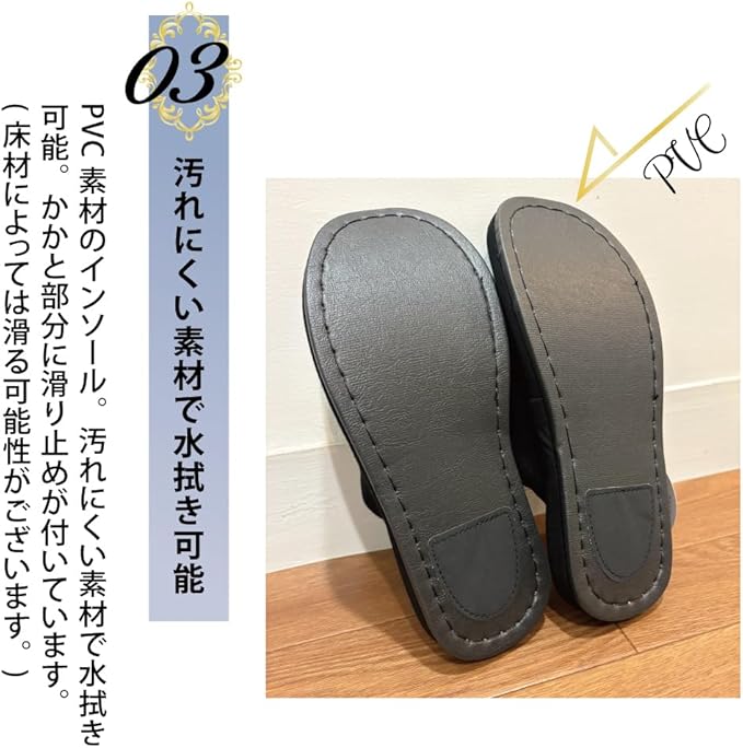 【汚れに強い底材、底裏には滑り止め付き】PVC生地を使用し、汚れてもサッとひと拭きでお手入れの手間いらず。さらに、一番体重のかかる踵部分に滑り止めを付け、滑りにくい仕様にしました。